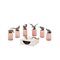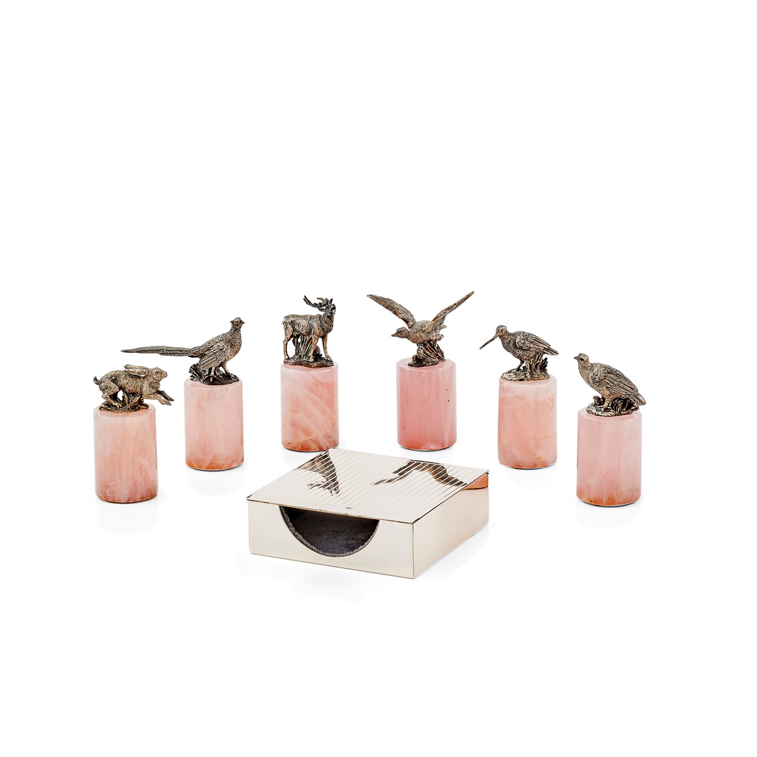 fermacarte in quarzo rosa con animali in argento e una scatola portacarte di forma quadrata.