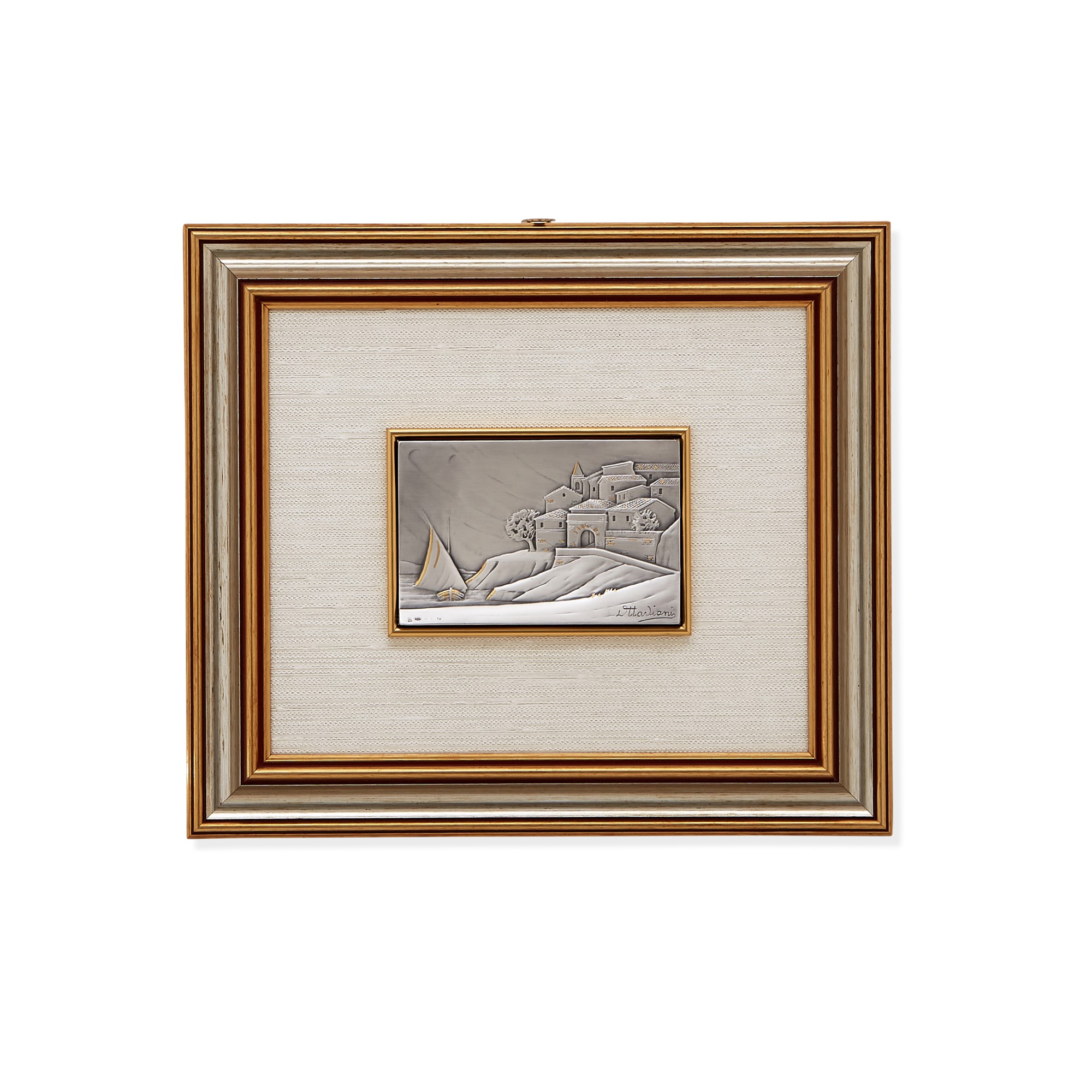 quadro con cornice in legno e al centro bassorilievo in argento raffigurante paesaggio collinare.