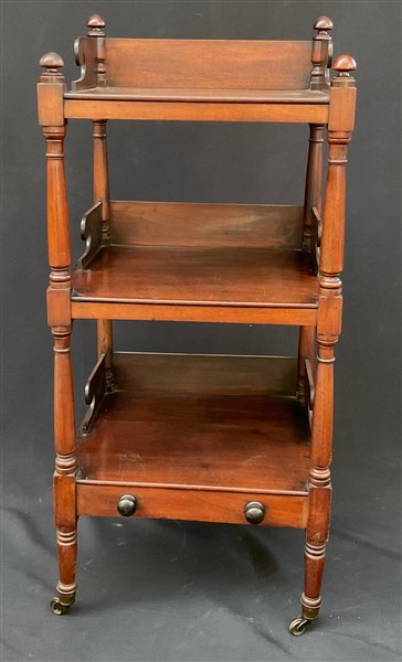 Etagere a tre ripiani con cassetti nellla base, montanti torniti e fasce sagomate, piedi muniti di rotelle. Inghilterra, XIX secolo (cm 54x122x46) (difetti)