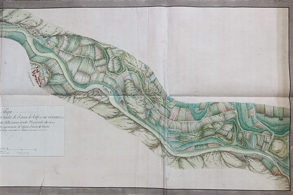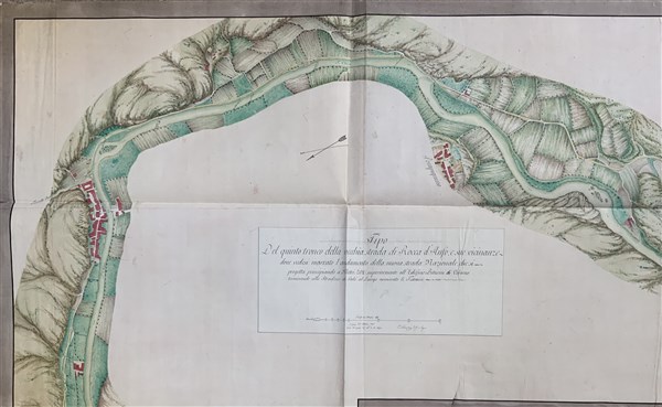 [MAPPA STRADALE - ROCCA D'ANFO] Tipo dl quinto tronco della vecchia strada di Rocca d'Anfo e sue vicinanze dove vedesi marcato l'andamento della nuova strada nazionale che si progetta...Carlo Donegani. Brescia 16 ottobre 1807. Mappa manoscritta acquarellata. (1010 x 2440 mm). (qualche piccolo strappo e difetti generici)