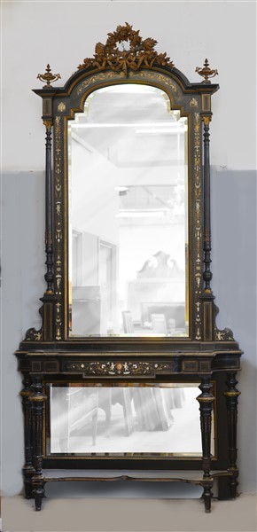 Console con specchiera in legno ebanizzato decorato con filettature, guarnizioni e profili in metallo dorato, cornice della specchiera e fascia della console riccamente intarsiate in osso, madreperla e ottone a motivi vegetali, fiori e putti in festa. Parte inferiore di forma sagomata con sostegni torniti e scanalati riuniti da pianetto, schienale a specchio. Specchiera di struttura architettonica decorata con colonne laterali tornite e scanalate e due coppe biansate nella parte superiore. Cimasa in legno intagliato, laccato e dorato a motivo di fiori, fiaccola e faretra. Lombardia secolo XIX (cm 147x276x48) (difetti e mancanze)