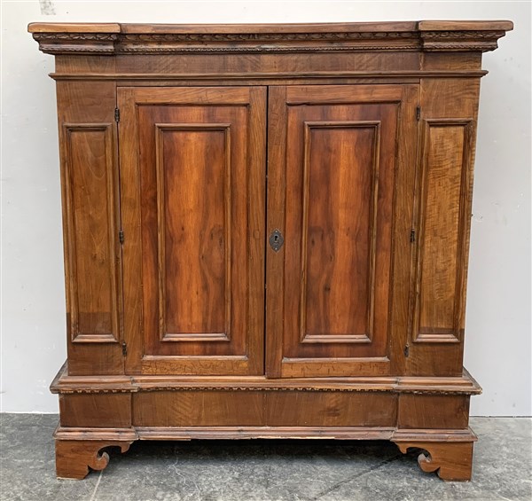 Antica credenza a due ante riquadrate, fascia superiore con profili intagliati, piedi a mensola (cm 138x142x49) (difetti)