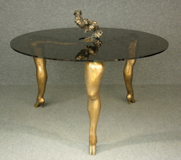 Firmato, datato. FINOTTI NOVELLO - Nato a Verona nel 1939. Nel 1964 espose a New York, due anni più tardi partecipò su invito, con un gruppo di opere, alla XXXIII Biennale Internazionale d'Arte di Venezia. Espose poi a Milano, Buenos Aires, Montevideo, Rio de Janeiro, San Paolo del Brasile, Tokio, Osaka, Hong Kong, Berlino Est e Lugano. Nel 1976 fu invitato alla Quadriennale Nazionale d'Arte di Roma, esponendo successivamente in Finlandia, Danimarca e Norvegia. Nel 1984 venne invitato con una sala alla XLI Biennale Internazionale d'Arte di Venezia, mentre tra il 1998 e il 2001 eseguì lavori su committenza, tra cui l'intervento completo della facciata della Basilica padovana di S. Giustina e il decoro in bronzo dorato per l'altare del Beato Giovanni XXIII, per la Basilica di S. Pietro a Roma. Nel 2002 realizzò una grande figura in marmo bianco di Carrara, rappresentante S. Maria Soledad, collocata in una nicchia esterna della Basilica di S. Pietro in Vaticano. Dal 2002 al 2005 si avvicendarono mostre personali. Vive e lavora a Sommacampagna (Verona) e a Pietrasanta (Lucca). Tavolo rotondo con piano in cristallo e base in bronzo raff. ''GAMBE, BRACCIA E UN MAZZO DI ROSE CENTRALE''. Firmato e datato 1972 sulla base. Fonderia Bonvicini - Verona. Mis. Alt. cm. 76 Diam. cm. 130 ca.