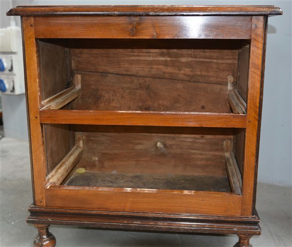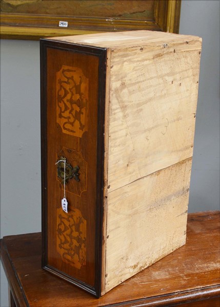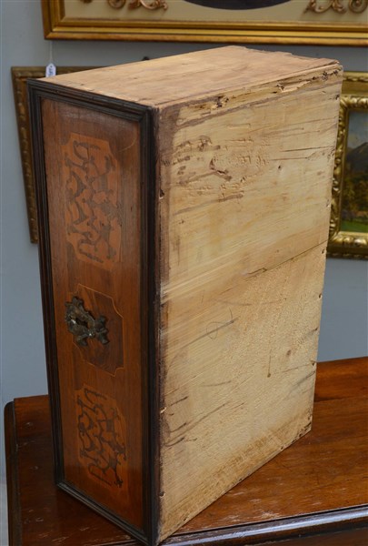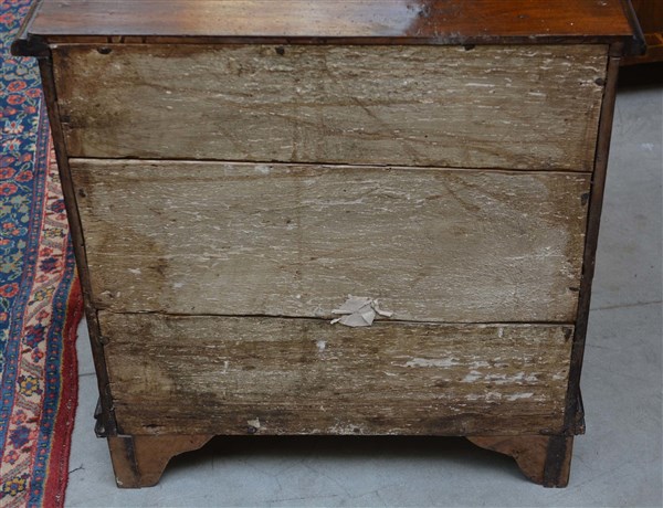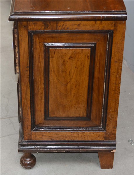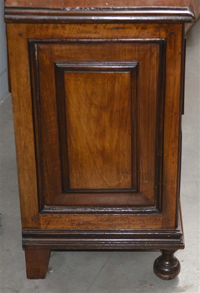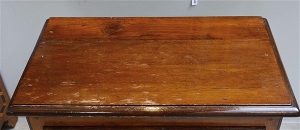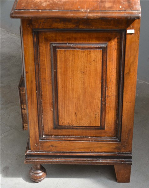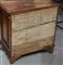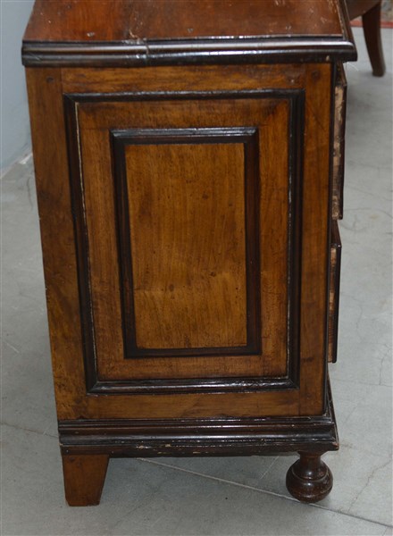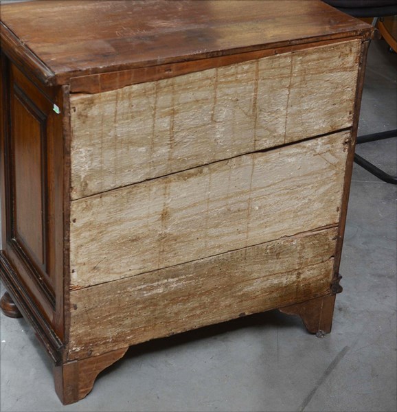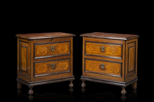 Coppia di comodini lastronati e intarsiati in noce a due cassetti, piedi anteriori torniti. Secolo XVIII (cm 72x75x41) (difetti)