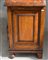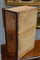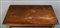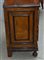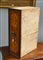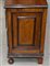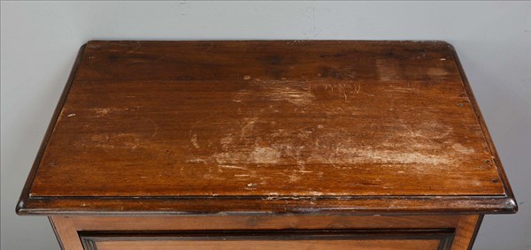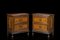 Coppia di comodini lastronati e intarsiati in noce a due cassetti, piedi anteri