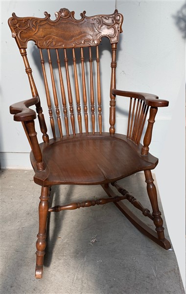 Sedia a dondolo in legno intagliato, schienale traforato, braccioli mossi, gambe tornite (h. cm 96)
