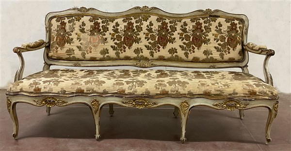 Divano in legno intagliato laccato e dorato, schienale sagomato, braccioli e ga
