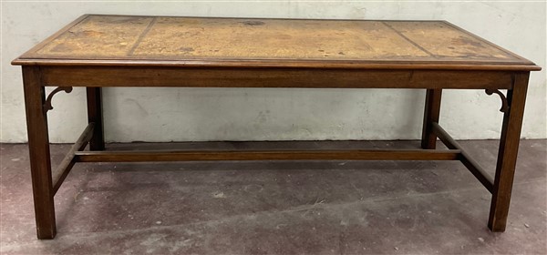 Tavolino da salotto in legno con gambe raccordate da traverse e piano con inserto in pelle incisa (cm104x40x50) (difetti)