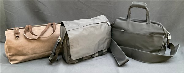 Lotto di tre borse di cui una da viaggio e una a tracolla in tessuto tecnico color nero e una in tela color marron glacée (cm varie) (segni d'uso)