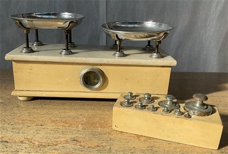 Bilancia da tavolo basculante in legno con piano in marmo, completa di pesi (di