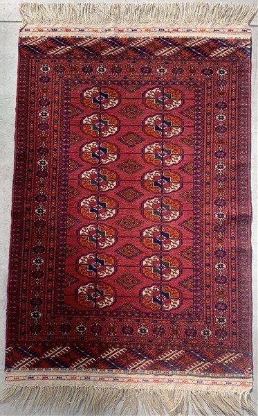 Tappeto Boukhara, Russia, secolo XX. Decoro con Gül su fondo bordeaux. (Lievi difetti)(cm 125x87)