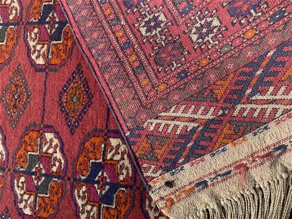 Tappeto Boukhara, Russia, secolo XX. Decoro con Gül su fondo bordeaux. (Lievi d