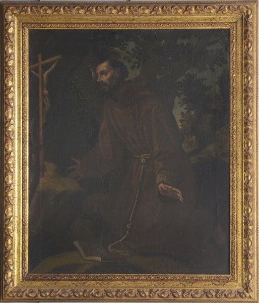 Scuola del secolo XVII "San Francesco in adorazione del crocifisso" olio su tela (cm 97,5x79,5). In cornice