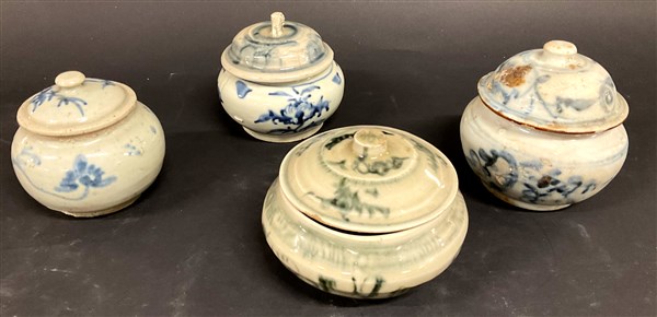 Lotto quattro scatole con coperchio in ceramica smaltata a decori floreali monocromi blu e verde. Cina, secolo XX (d max cm 12) (difetti)