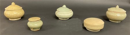 Lotto di cinque scatole con coperchi in ceramica a invetriatura celadon di cui