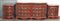 Fornitura da camera composta da un comò a otto cassetti su fronte mossa e una coppia di comodini a tre cassetti. Legno laccato rosso con pannelli intagliati a volute e fiori stilizzati argentati (cm143x81x50 e 53x67x36) (difetti)