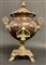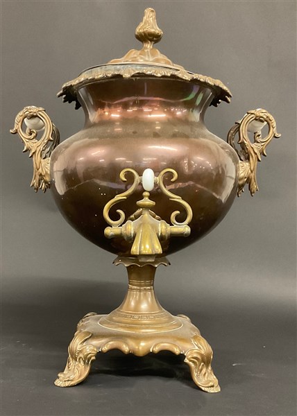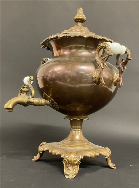 Samovar in rame e ottone con decoro a foglie e volute, anse con prese in opaline, inizio secolo XX (h cm 47) (difetti)