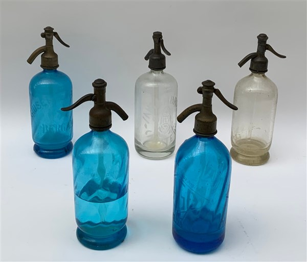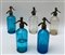 Gruppo di cinque bottiglie per seltz in vetro incolore e azzurro. Inizio XX secolo (h cm 30) (lievi difetti)
