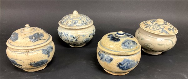 Lotto di quattro scatole con coperchi in ceramica smaltata a decori floreali monocromi blu. Cina, secolo XX (d max cm 12) (difetti)