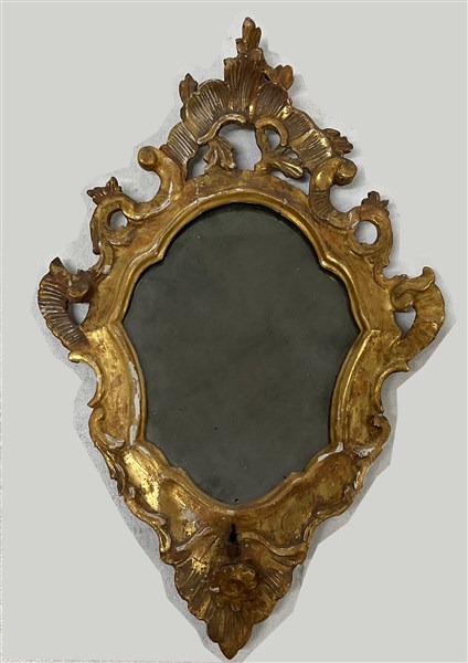 Specchierina di forma sagomata in legno dorato e intagliato a conchiglie, fiori e volute (cm 62x40) (difetti, mancanze e restauri)