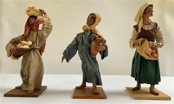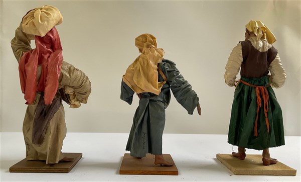 Tre figure da presepe in terracotta e cartapesta, firmate (h. max cm 33) (difetti)