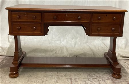 Scrittoio lastronato a cinque cassetti, gambe sagomate terminanti con piedi torniti riuniti da traversa (cm 120x76x60) (difetti)