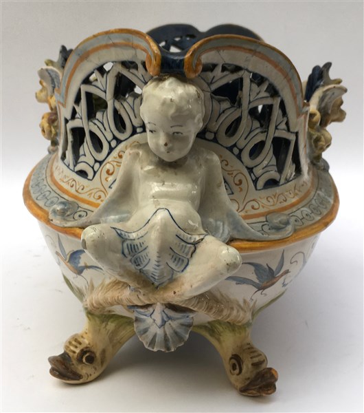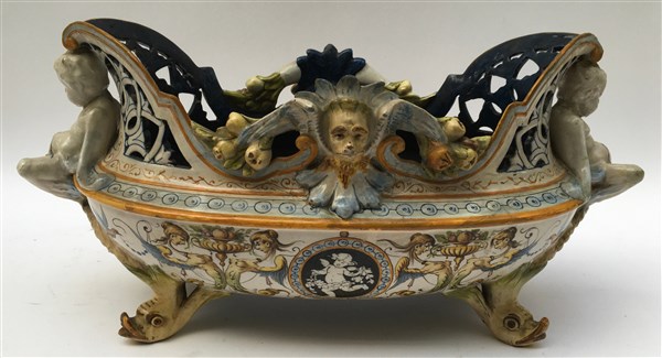 Manifattura di Ginori, inizio secolo XX. Centrotavola in ceramica decorata in policromia a figure classiche. Anse a foggia di putti, bordo traforato decorato da mascheroni tra frutti, piedi a mostri marini. Marcato e numerato alla base (cm 43x20x22) (difetti e restauri)