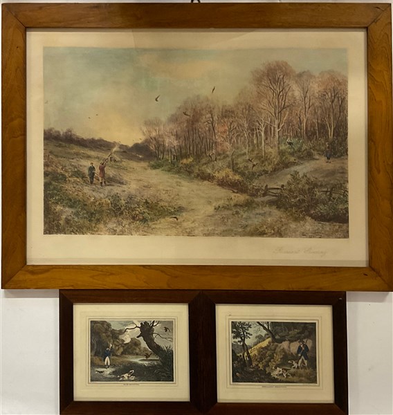 Lotto composto da due incisioni e una riproduzione raffiguranti scene venatorie