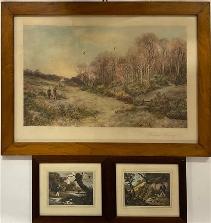 Lotto composto da due incisioni e una riproduzione raffiguranti scene venatorie, misure diverse