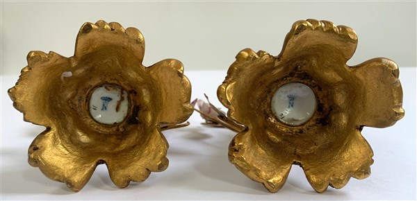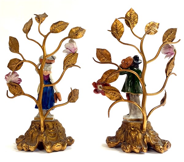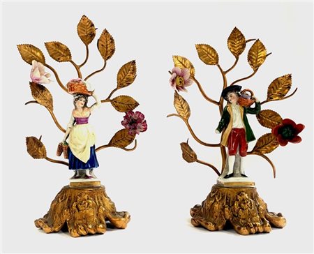 Manifattura di Capodimonte, due figure in porcellana, montate su base in metallo dorato marcate sotto la base (h cm 19) (difetti e mancanze)