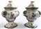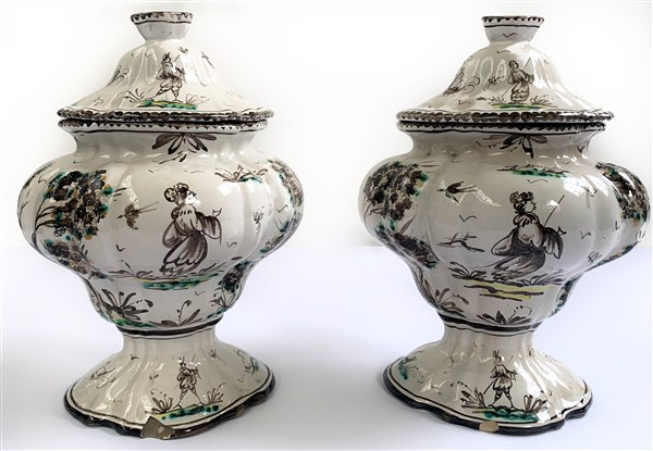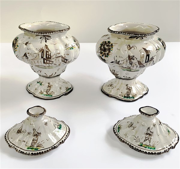 Coppia di vasi in maiolica con coperchio, decorati a figure e paesaggi, marcati