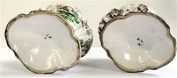 Coppia di vasi in maiolica con coperchio, decorati a figure e paesaggi, marcati "MGA" (h cm 26,5) (difetti e sbeccature)