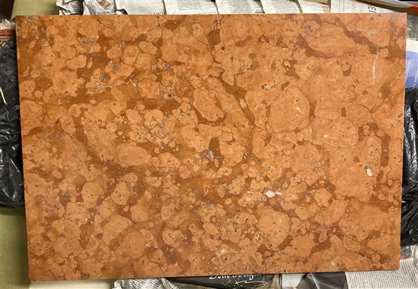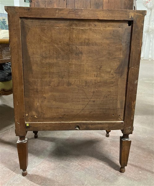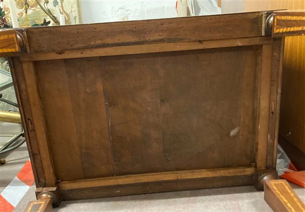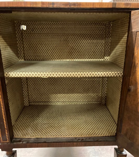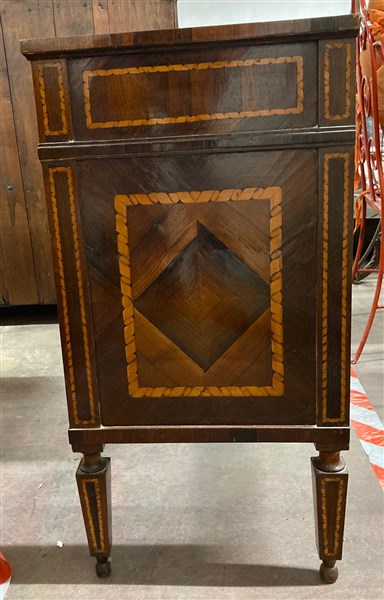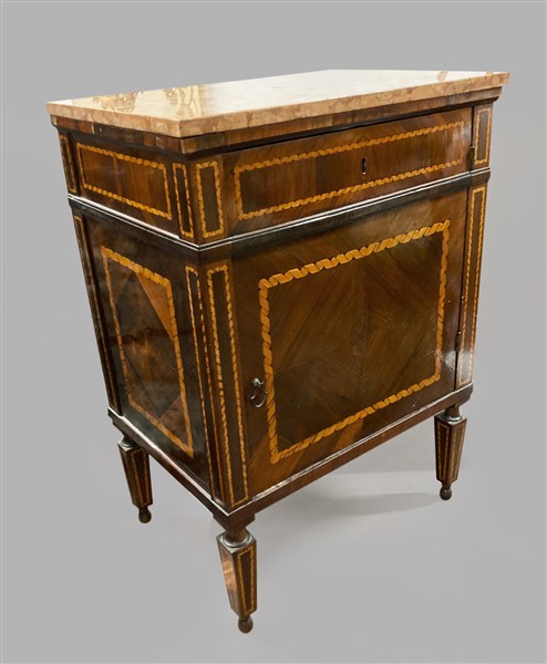 Mobiletto lastronato e intarsiato a motivo stilizzato, fronte ad un anta con finto cassetto, piedi rastremati, piano in marmo rosso di Verona (cm 63x86,5x43) (difetti)