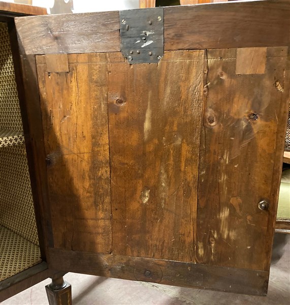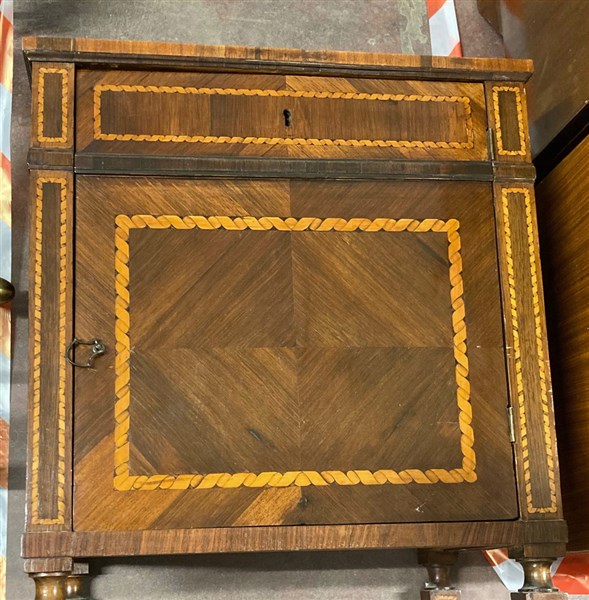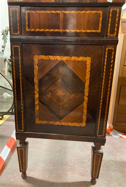 Mobiletto lastronato e intarsiato a motivo stilizzato, fronte ad un anta con fi