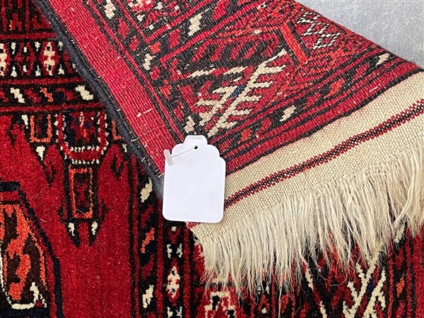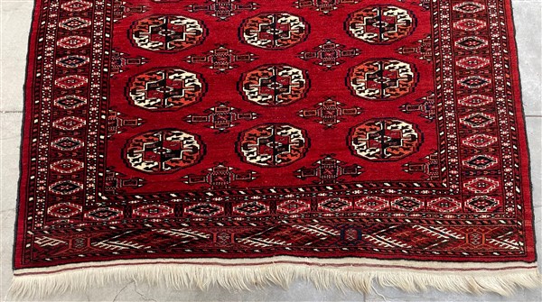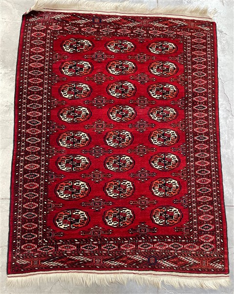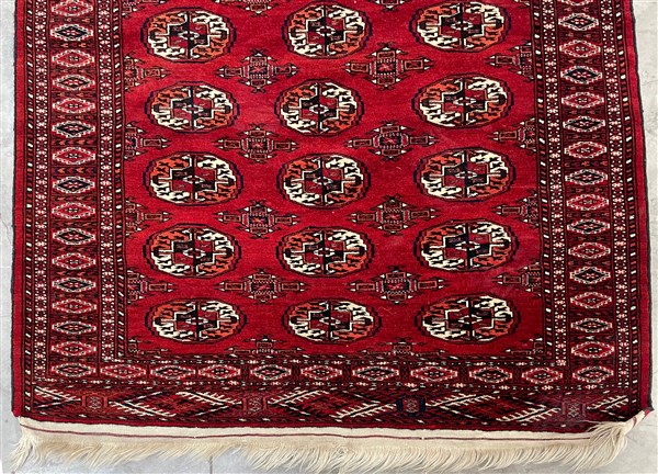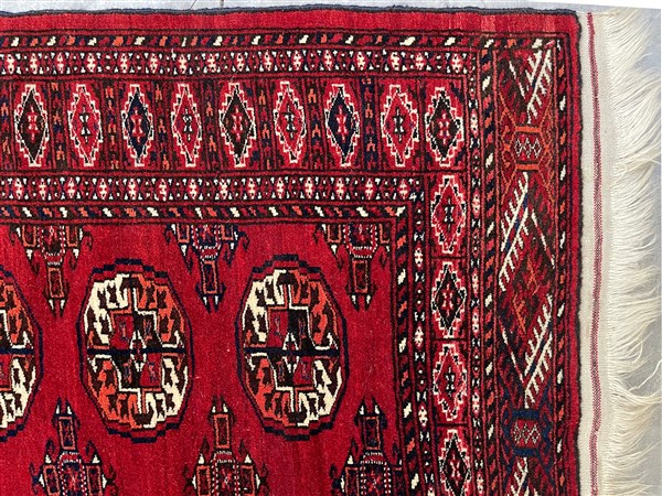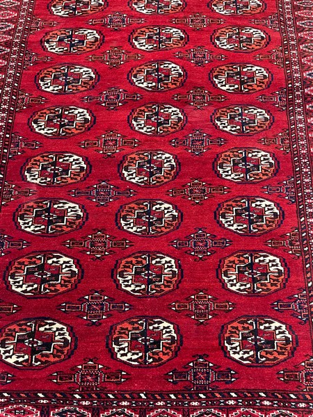 Tappeto Boukhara Tekkè, Turkestan occidentale, inizio secolo XX. Decoro con Gul su fondo rosso (cm 165x128) (lievi difetti)