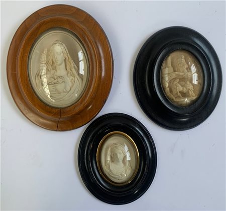 Gruppo di tre rilievi raffiguranti Madonna, Madonna Addolorata e Deposizione, secolo XIX (cm max 11,5x8,5) in cornici (difetti)