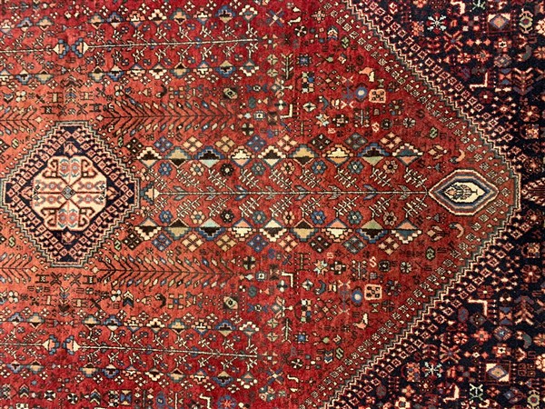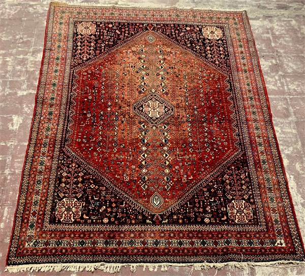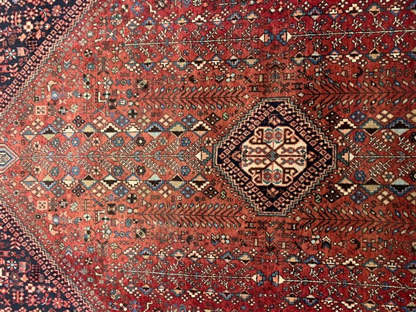 Tappeto Shiraz, Persia, secolo XX. Decoro con piccolo medaglione romboidale su