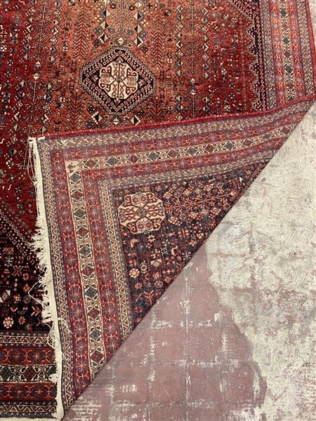 Tappeto Shiraz, Persia, secolo XX. Decoro con piccolo medaglione romboidale su campo rosso (cm 301x210) (lievi difetti)