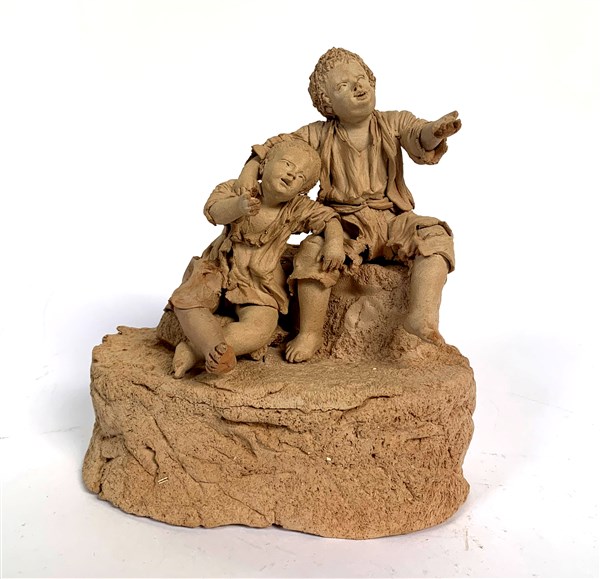 Manifattura di Caltagirone inizio secolo XX, "Mendicanti" gruppo in terracotta