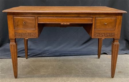 Scrittoio da centro con fronte a due cassetti laterali ed uno centrale sottopiano. Intagliato a motivi geometrici nella fascia inferiore. Gambe rastremate e scanalate con strozzatura all'attacco (cm 119x76x64) (difetti)