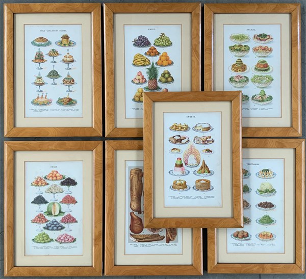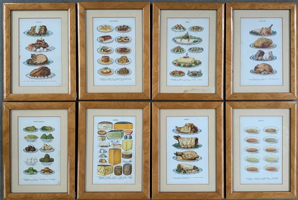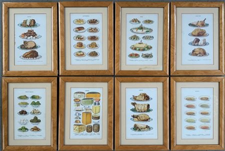 Gruppo di quindici stampe a colori inerenti il cibo (cm 20x12) in cornici