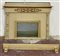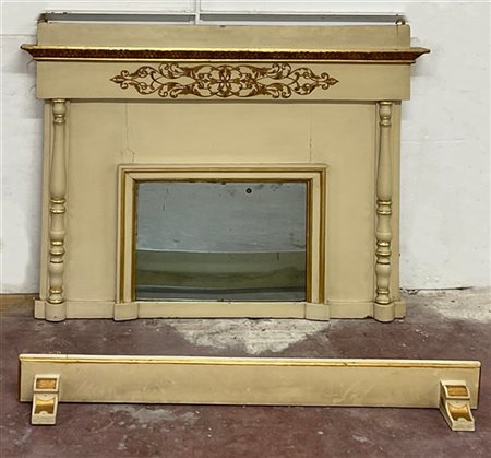 Lotto composto da una caminiera in legno laccato e dorato decorata con mezze colonne tornite ai lati, dipinta a volute e foglie nella parte superiore cimasa intagliata a motivi vegetali, secolo XIX (cm 107x140) Unita ad una mensola analoga (difetti)