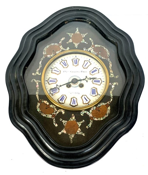 Orologio da parete del tipo "occhio di bue" in legno ebanizzato e intarsi in madreperla. Quadrante in alabastro con cartouches smaltate a cifre romane. Movimento con suoneria delle ore e mezze su gong. Francia, ultimo quarto XIX secolo (h cm 51) (Difetti)