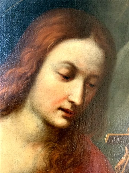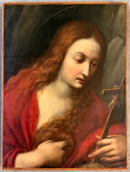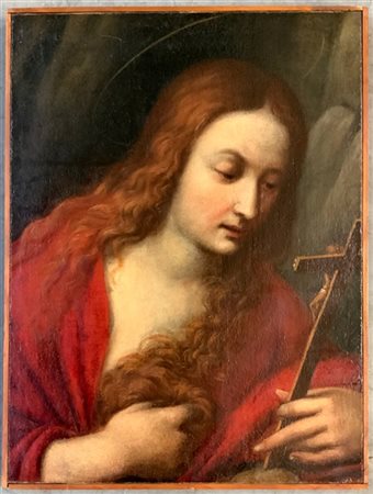 Scuola della fine del secolo XVII "Maddalena in adorazione del crocifisso" olio