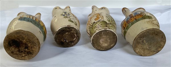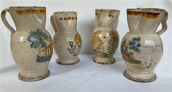 Manifattura meridionale, quattro brocche in maiolica policroma di diverso decor