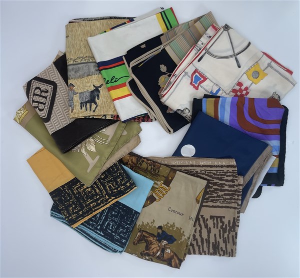 Lot comprising twelve scarves the majority in silk (defects and discoloration)