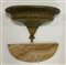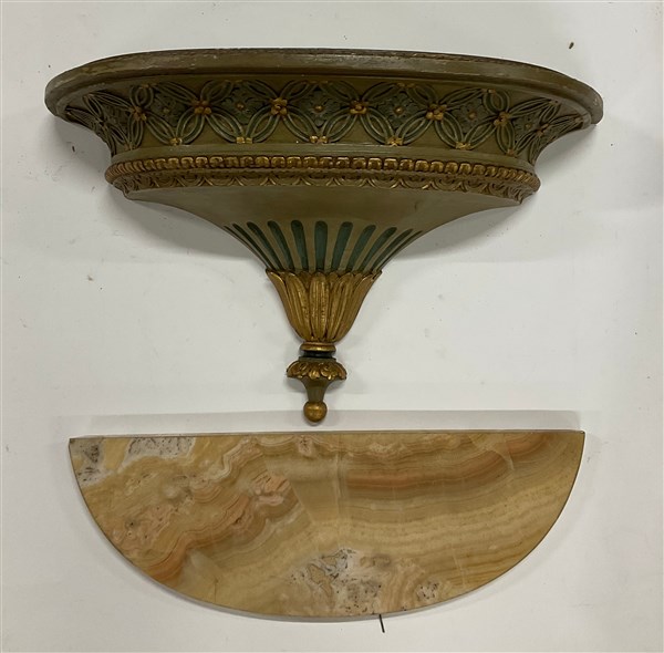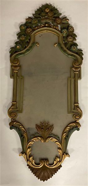 Piccola consolle pensile con specchiera in legno intagliato a motivi floreali e laccato in policromia, piano in onice (specchiera cm 109x46, console cm 54x31x21) (difetti)