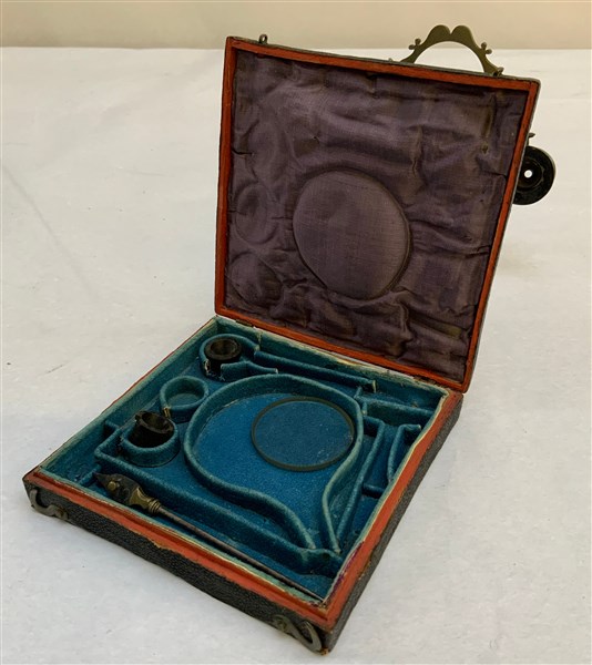 Microscopio semplice acquatico in ottone corredato dai suoi strumenti. Montato su custodia originale. Francia, ultimo quarto XVII secolo (difetti)