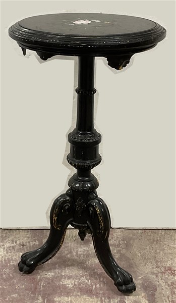 Tavolino tondo tripode in legno ebanizzato, piano in commesso di pietre dure a mazzo di fiori. Fine secolo XIX (h cm 80, d cm 44) (difetti)