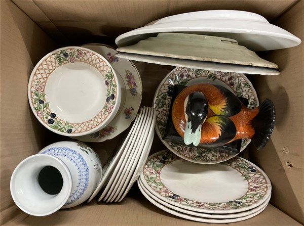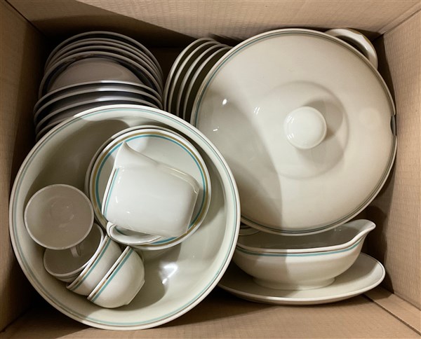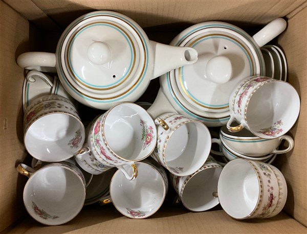 Lotto di tre cartoni contenenti parti di servizi di piatti e altri oggetti di fatture differenti (difetti)